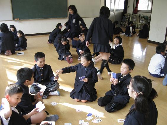 1年生から6年生がそれぞれ異学年グループをつくり、6年生へお礼の言葉を伝えたり、プレゼントを渡したりしました。 その後、運動場や体育館でトランプをしたり、「だるまさんが転んだ」をしたりして、学年をこえて楽しい時間を過ごすことができました。 |