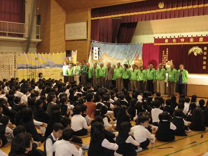 1,2時間目の授業参観終了後、体育館にて子ども安全の日についての行事とPTA親善行事が行われました。 まず、地域で見守りボランティアをされている方々の紹介と児童が感謝の気持ちを発表しました。 ![]() その後、横谷神楽団による神楽『土蜘蛛』と『大蛇(おろち)』を鑑賞しました。軽やかな笛の音や床をも揺るがすような力強い太鼓のリズム、舞台上では武士たちのリズミカルな立ち振る舞いや、迫力ある大蛇を目の当たりにして、子どもたちは日本の伝統文化に触れることができました。 ![]() ![]() ![]() |
